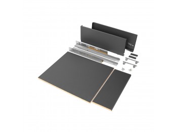 Kit para cajón para cocina y baño Vertex con todos los elementos necesarios para su montaje. Es la solución óptima para los muebles de tu cocina, baño o armario con un elegante diseño en color gris antracita y blanco. Cada kit se compone de todos los elementos necesarios para el montaje de un cajón de altura 131 mm, dimensionado para un espesor de tablero de 16 mm para el fondo y la trasera del cajón. Incluye: dos costillas laterales, un juego de guías con cierre suave, un juego de tapas embellecedoras y las fijaciones para el frente del cajón.