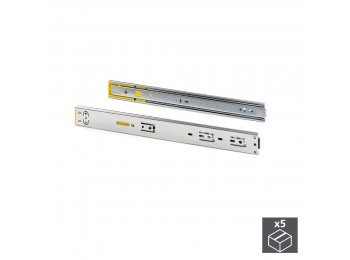 Guías de extracción total para cajones con cierre suave que proporciona un cierre amortiguado del cajón, y un deslizamiento suave y silencioso gracias a sus rodamientos de bolas de alta calidad. Éstas guías disponen de sistema push de expulsión al presionar el cajón. Destacan además por su gran capacidad de carga que puede llegar a soportar hasta 30 kg por cajón. Su montaje al cajón se realiza mediante tornillos y el desmontaje con un gatillo que posee la propia guía.