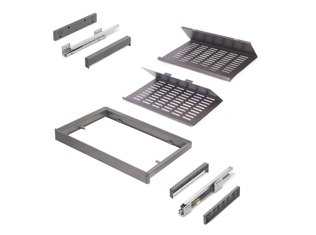 Está disponible para módulos de 600, 700, 800 y 900 mm, con una regulación de hasta 13 mm en cada una de sus guías, que asegura un ajuste preciso al ancho del armario. Su montaje es rápido y sencillo, sin necesidad de herramientas adicionales, basta con atornillar en los laterales del armario.
