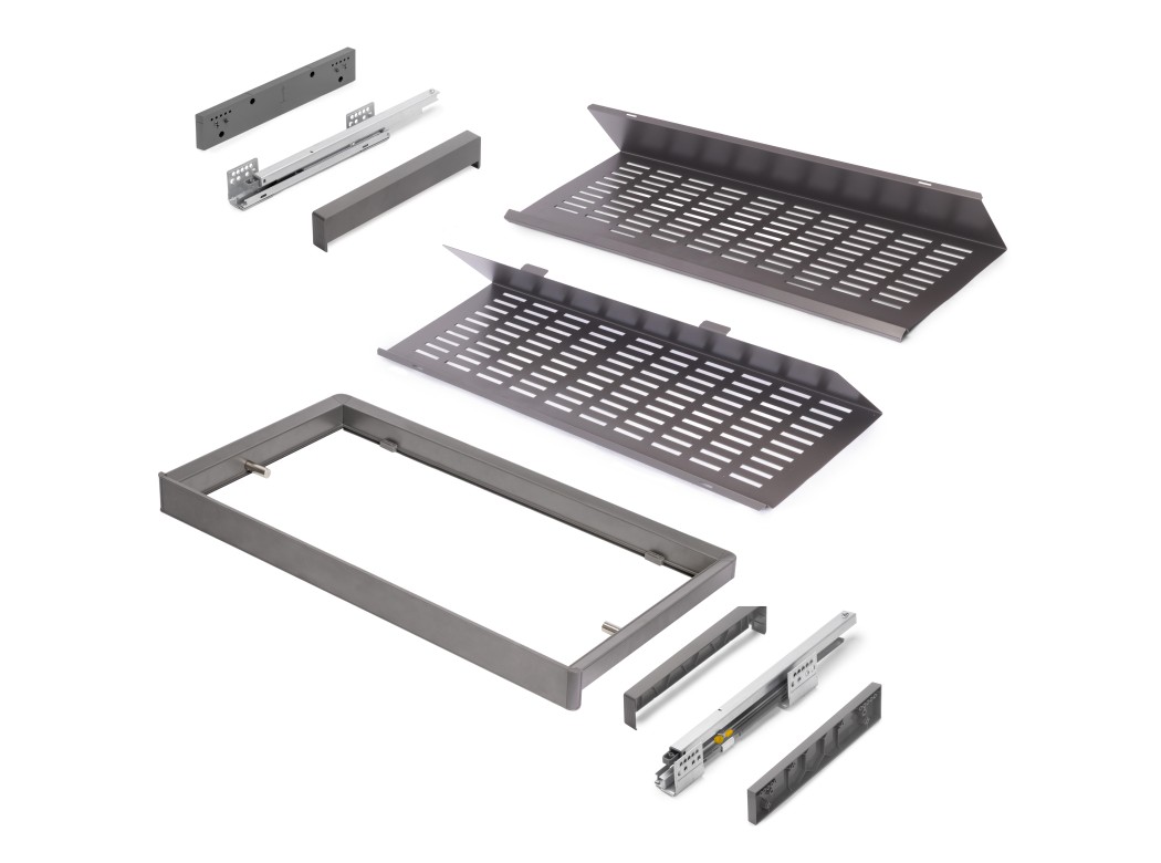 Está disponible para módulos de 600, 700, 800 y 900 mm, con una regulación de hasta 13 mm en cada una de sus guías, que asegura un ajuste preciso al ancho del armario. Su montaje es rápido y sencillo, sin necesidad de herramientas adicionales, basta con atornillar en los laterales del armario.