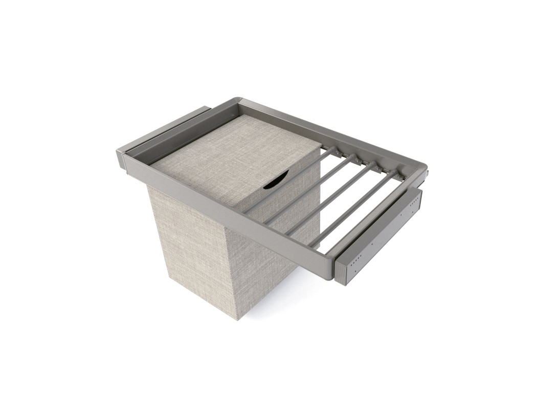 Kit compuesto por un pantalonero de 7 varillas, un cesto de ropa para la colada y un bastidor de guías de ancho regulable para módulos de 60 cm.