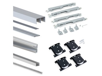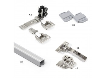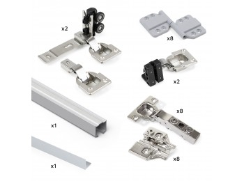 1 jg de herrajes para dos puertas, 1 jg de dispositivos para el cierre suave, 1 carril superior de 2.35m, 1 carril inferior de 2.35m, 1 tapa de carril inferior de 2.35m, 4 perfiles tiradores de 2.35m, 1 perfil travesaño U de 2.35m