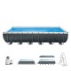 Piscina sobresuelo formato rectangular INTEX, gama Ultra XTR Frame, medidas de 732x366x132 cm y capacidad para 31.805 litros. Estructura demetal galvanizado, con 18 contrafuertes revestidos con epoxi y lona tricapa de PVC-poliéster de granresistencia (grosor de 0.67 mm) Incluye de puradora de arena 7.900 litros/hora (arena no incluida), escalera de seguridad, tapiz y cobertor. Dispone de tapón dedrenaje con conexión a manguera de jardín para vaciar el agua de la piscina deforma rápida y segura. El uso de la piscina está recomendado a partir de los 6 años, tiene un montaje sencillo sin herramientas, tiempo aproximado deinstalación: 60 minutos