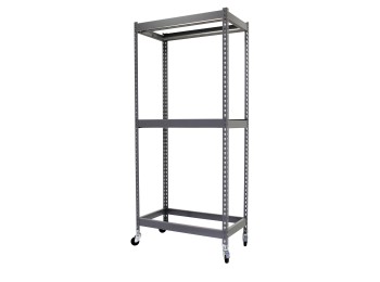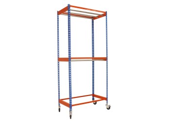Estantería para prenda colgada, de color AZUL/NARANJA. Las dimensiones de esta estantería son: 3000x1500x750 mm. Y tiene una capacidad de carga de 30 kgs. Incluye ruedas. Es fabricado en España y se monta rápido siguiendo las instrucciones.El número de colgadores por módulo es: 3
