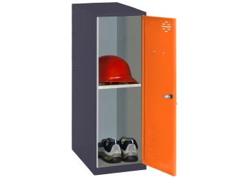 Casillero metálico mini con patas de color ANTRACITA y las puertas NARANJA. Las dimensiones de la taquilla sin los pies son: 915x400x500 mm. Las dimensiones de la taquilla con los pies son: 1015x400x500 mm. Se entrega MONTADO e incluye un respiradero para mantener el interior ventilado, una cerradura de cilindro con dos llaves que se puede cambiar bajo pedido por cualquiera de las otras cerraduras de Simonrack y un etiquetero para aportar información acerca de su uso o su propiedad. Este casillero mini se puede acoplar fácilmente a otro casillero Simonrack del mismo tamaño o superior, del mismo o distinto color, adaptándose perfectamente al espacio que necesite el usuario, combínalos como quieras. Ideal para poner debajo de la mesa, en el baño para guardar toallas, en un vestuario etc.