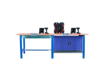 Banco de trabajo con tornillos y encimera de haya laminada, y cuentan con estantes inferiores que tienen una capacidad de carga de 300 kgs aportándole mucha resistencia al banco de trabajo. Cuenta con 2 cajones metálicos con guías telescópicas para una mayor facilidad de uso. La encimera de haya laminada de 32 mm de espesor que aguanta mejor el impacto y los golpes. Es de color GRIS. Las dimensiones de este banco de trabajo son: 865x2100x750 mm. La encimera principal tiene una capacidad de carga en estático de 1000 kgs de forma uniformemente repartida por la superficie. Está fabricado en España y se monta fácil siguiendo las instrucciones.
