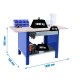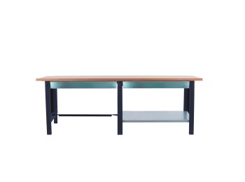 Banco de trabajo con tornillos y encimera de haya laminada, y cuenta con un estante inferior que tiene una capacidad de carga de 300 kgs aportándole mucha resistencia al banco de trabajo. Con un cajón metálico con guías telescópicas para mayor facilidad de uso. La encimera de haya laminada de 32 mm de espesor que aguanta mejor el impacto y los golpes. Es de color AZUL. Las dimensiones de este banco de trabajo son: 865x1800x750 mm. La encimera principal tiene una capacidad de carga en estático de 1000 kgs de forma uniformemente repartida por la superficie. Está fabricado en España y se monta fácil siguiendo las instrucciones.