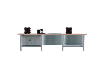 Banco de trabajo con tornillos y bandeja metálica, y cuenta con un estante inferior que aguanta 300kgs, aportándole mucha resistencia al banco de trabajo. Incluye 5 cajones para guardar y almacenar las herrmientas. Es de color GRIS. Las dimensiones de este banco de trabajo son: 830x1800x730 mm. La encimera principal tiene una capacidad de carga de 600 kgs. El cajón aguanta hasta 35 kgs y cuenta con guías telescópicas para una mayor facilidad de uso. Está fabricado en España y se monta fácil siguiendo las instrucciones.