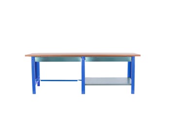 Banco de trabajo con tornillos y encimera de haya laminada, y cuentan con estantes inferiores que tienen una capacidad de carga de 300 kgs aportándole mucha resistencia al banco de trabajo. La encimera de haya laminada de 32 mm de espesor que aguanta mejor el impacto y los golpes. Es de color GRIS. Las dimensiones de este banco de trabajo son: 865x2600x750 mm. La encimera principal tiene una capacidad de carga en estático de 1000 kgs de forma uniformemente repartida por la superficie. Está fabricado en España y se monta fácil siguiendo las instrucciones.
