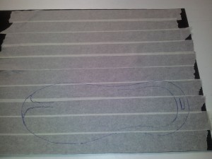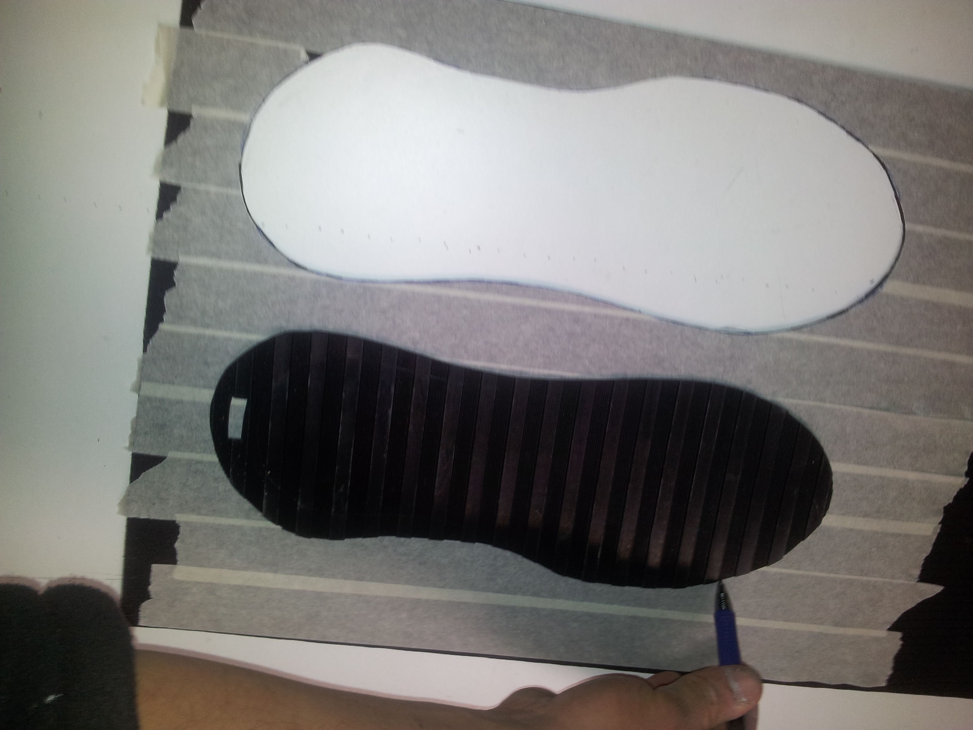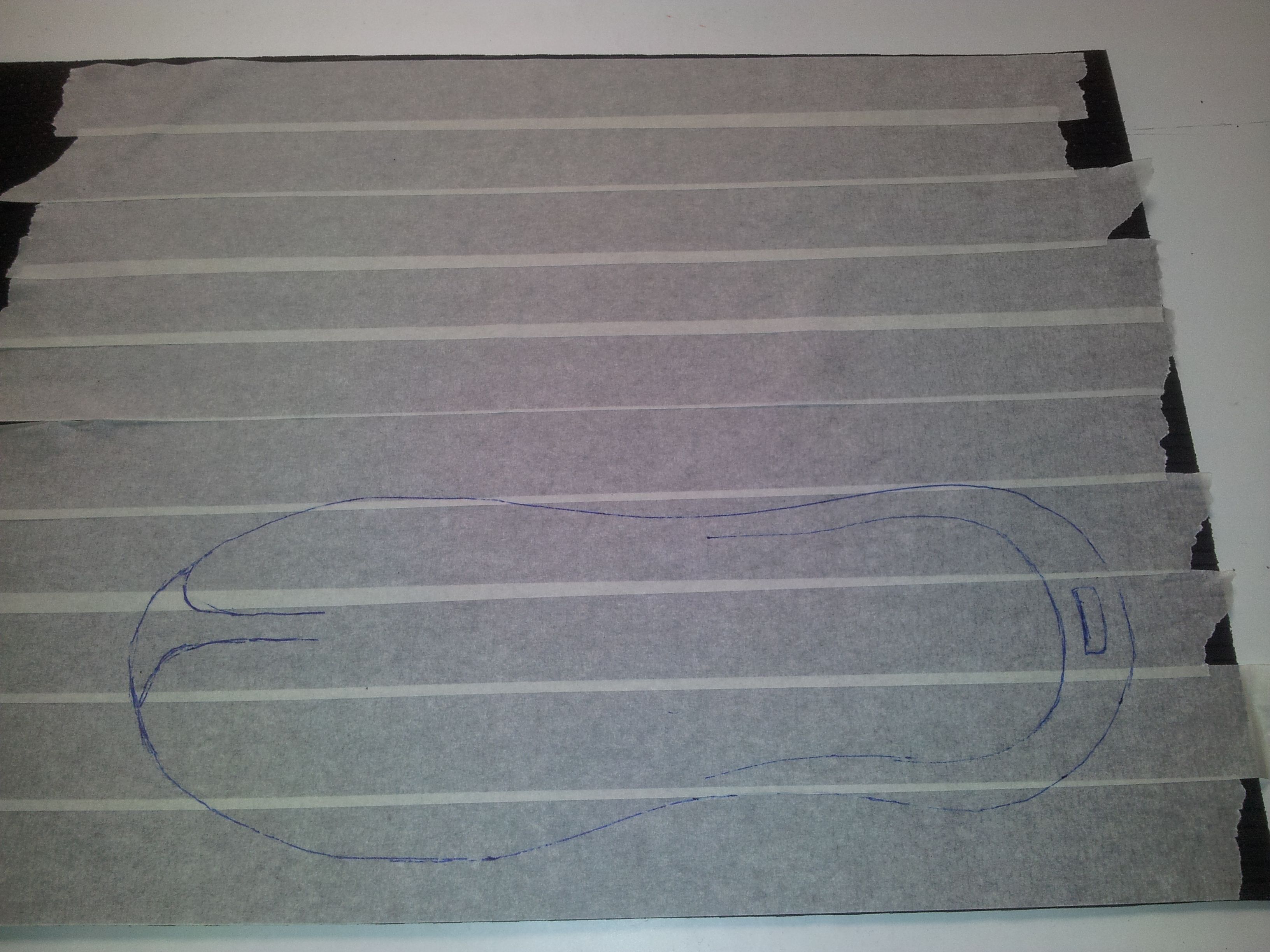 Dibujamos sobre la cinta de carrocero la silueta de nuestros zapatos con la forma para el dedo gordo y la del talón