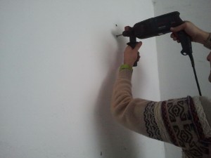 Situamos el soporte donde queremos colocarlo y marcamos con un lapicero la posición de los agujeros, con el taladro en posición percutor y usando la broca hacemos los agujeros (si el taladro lo permite es mejor empezar a pocas revoluciones para ir aumentándolas poco a poco), introducimos los tacos en los agujeros y por último anclamos el soporte en la pared usando los tirafondos.