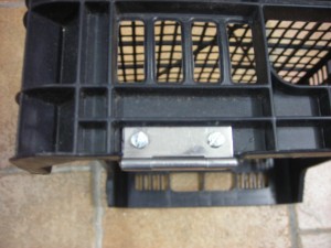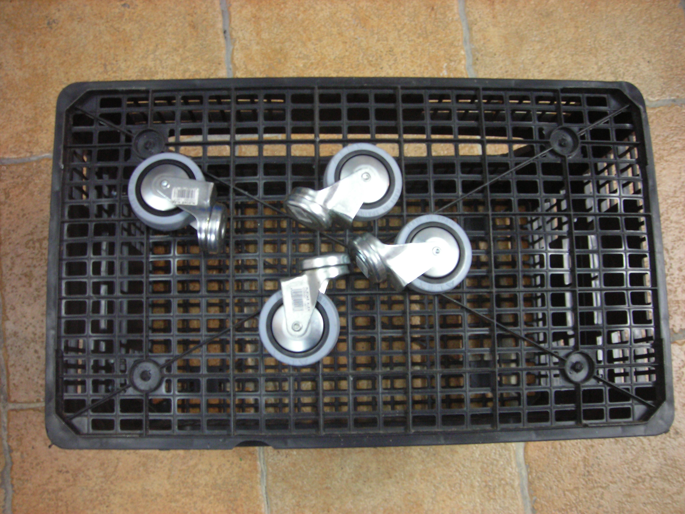 Por último colocamos 4 ruedas sujetas con unos tornillos din603 de 8×20 tuercas y arandelas. Estos tornillos tienen la peculiaridad de tener la cabeza cóncava y un cuadradillo en la base, su uso habitual es en trabajos con madera. Hacemos los taladros con una broca de 10mm. y sujetamos las ruedas apretando las tuercas con una llave estrella acodada 12-13.