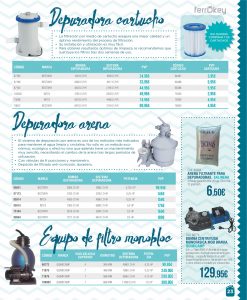 Y por último llegamos a la sección del cuidado del agua de las piscina destacando un gran surtido de cobertores de verano e invierno, equipos de filtración de arena o cartucho y por último los imprescindibles químicos (cloro, oxigeno, antialgas, controladores de PH…)