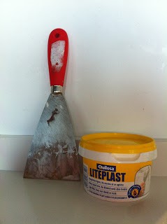 - Tapamos los agujeros con alguna masilla de las que vienen preparadas, las podemos encontrar en diferentes tipos de envases tubos, tarrinas, bolsas…o bien usamos las que se presentan en polvo. Si el agujero es grande podemos hacer una bola con algodón, papel de cocina… la mezclamos con la pasta tapagrietas y la usamos para rellenar la mayor parte de agujero.