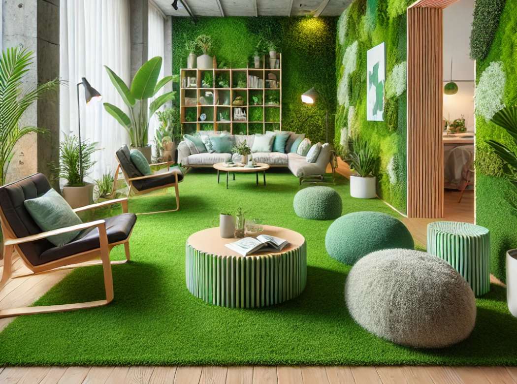 Por ejemplo, una mesa de centro con césped artificial en la parte superior puede convertirse en el centro de atención de tu sala de estar. Las sillas con asientos de césped artificial no solo son cómodas, sino que también añaden un elemento lúdico y moderno a la decoración.